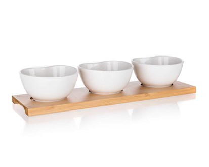 Sada 3 kulatých porcelánových misek na bambusovém podnosu o celkových rozměrech 32,6 x 9,5 x 6 cm, je ideální pro servírování různých druhů oříšků, sušeného ovoce, oliv apod.