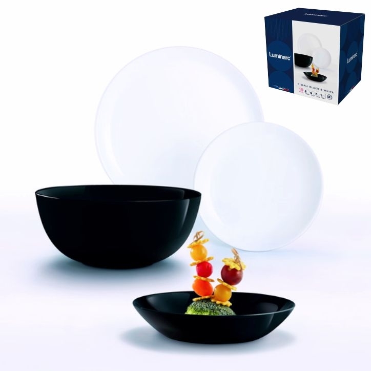 Jídelní sada 18ks vyrobená z opálového skla. Sada obsahuje 6 ks mělký talíř bílý průměr 27 cm, 6 ks hluboký talíř černý průměr 22 cm, 6 ks dezertní talíř bílý průměr 19 cm, mísa černá průměr 21 cm. Vhodné do myčky, vhodné do mikrovlnné trouby. EAN 0883314750362