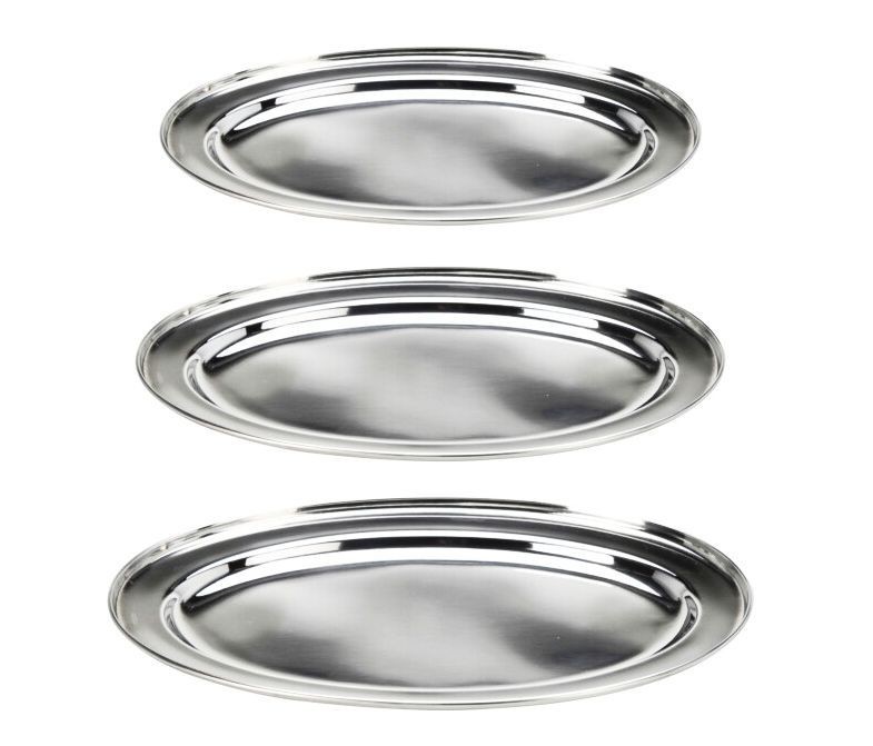 SERVING PLATE SET OF 3PCS STAINLESS STEEL 201, OVAL SHAPE, 3 SIZES, TOTAL WEIGHT 990 GRAM, EACH SET SHRINKED WITH OUR DESIGN COLOURLABEL, BARCODE LABEL ON THE BOTTOM/ 445X290X30MM, Shrinkwrapped insertlabel (SWL): 1 X Big 450x290mm, Stainless steel,1 X Medium 400x265mm,1 X Small 340x215mm / CFT...