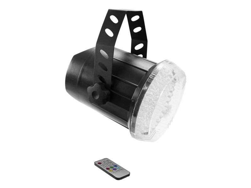 Kompaktní stroboskop osazený 164x 10 mm LED. Barva záblesků bílá (teplota barev studená bílá, 6800K). Nastavitelná rychlost záblesků pomocí otočného potenciometru na zadním panelu světelného efektu nebo pomocí dodávaného dálkového IR ovladače. Automatický provozní režim, vyzařovací úhel cca. 11°. Dodáváno včetně montážního držáku. Ideální světelní efekt pro taneční parkety i pro domácí zábavu.
