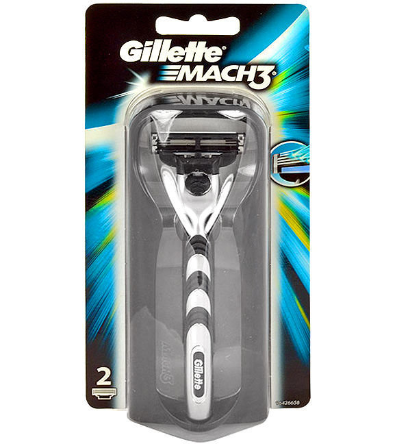**Holicí strojek se dvěma hlavicemi Gillette Mach3**. Tříbřitvá hlavice s DLC hranami a vylepšeným zvlhčujícím proužkem pro holení bez podráždění pokožky. Všechny hlavice Mach3 se dají používat do všech strojků Mach3. číst celé