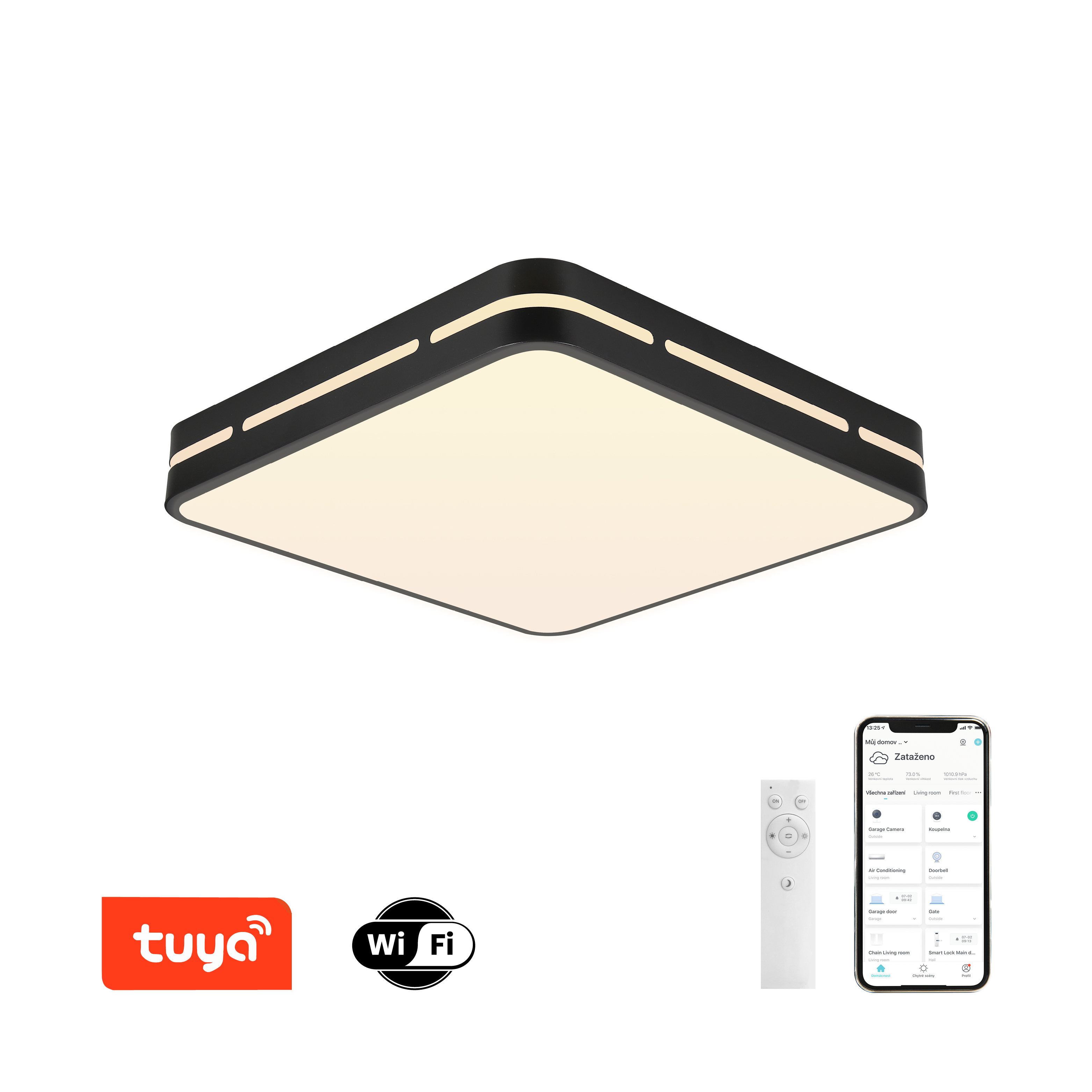 Protokol: Tuya Wi-fi Materiál: hliník, kov, plast Barva svítidla: černá matná Rozměry: 42 x 42 x 6cm Příkon: 48W Světelný tok: 2800lm Barva světla: CCT 2700-6500K Stmívatelný: ano Doba svícení 50 000 hod Vstupní napětí zdroje: AC 220V CRI(Ra) Index podání barev: >80 (denní světlo má hodnotu Ra...