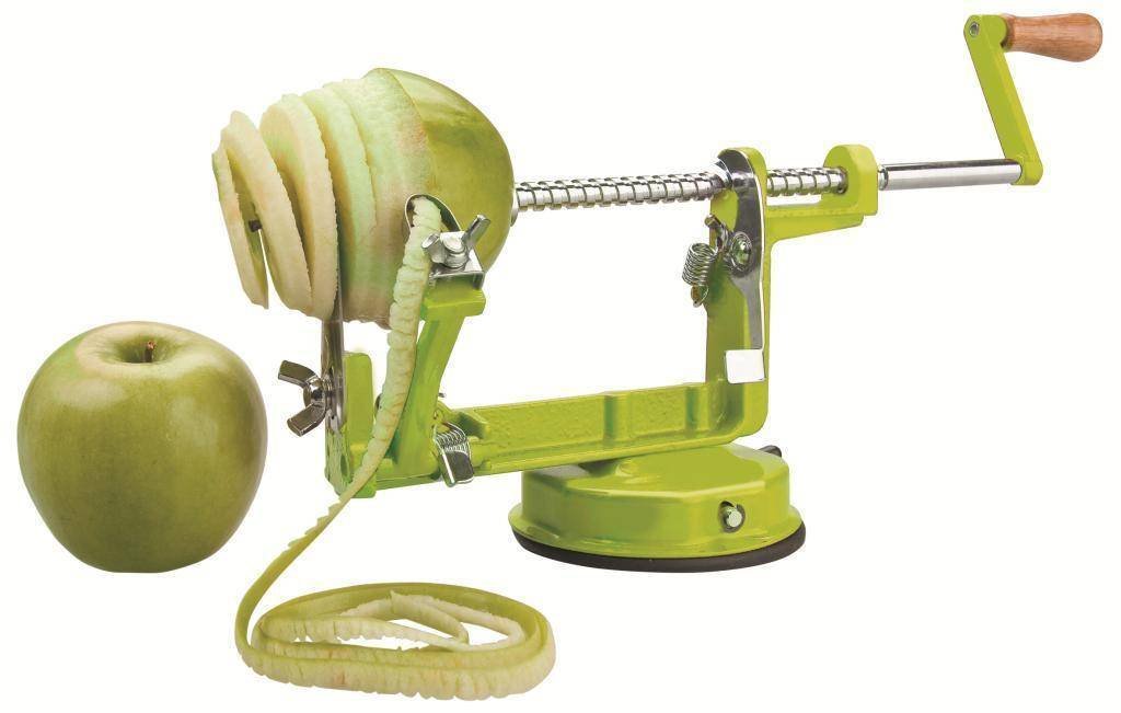 Moderní nástroj pro loupání a porcování jablek. Praktická škrabka, která zbaví jablka nejenom slupky, ale také jadřinců a jablko naporcuje do spirály.