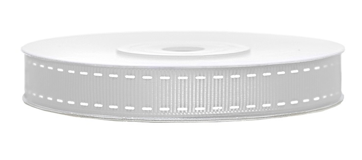 Tasiemka rypsowa w kolorze srebrnym z białym nadrukiem, szerokość 15 milimetrów, długość 25 metrów. Pakowanie: 1 sztuka.