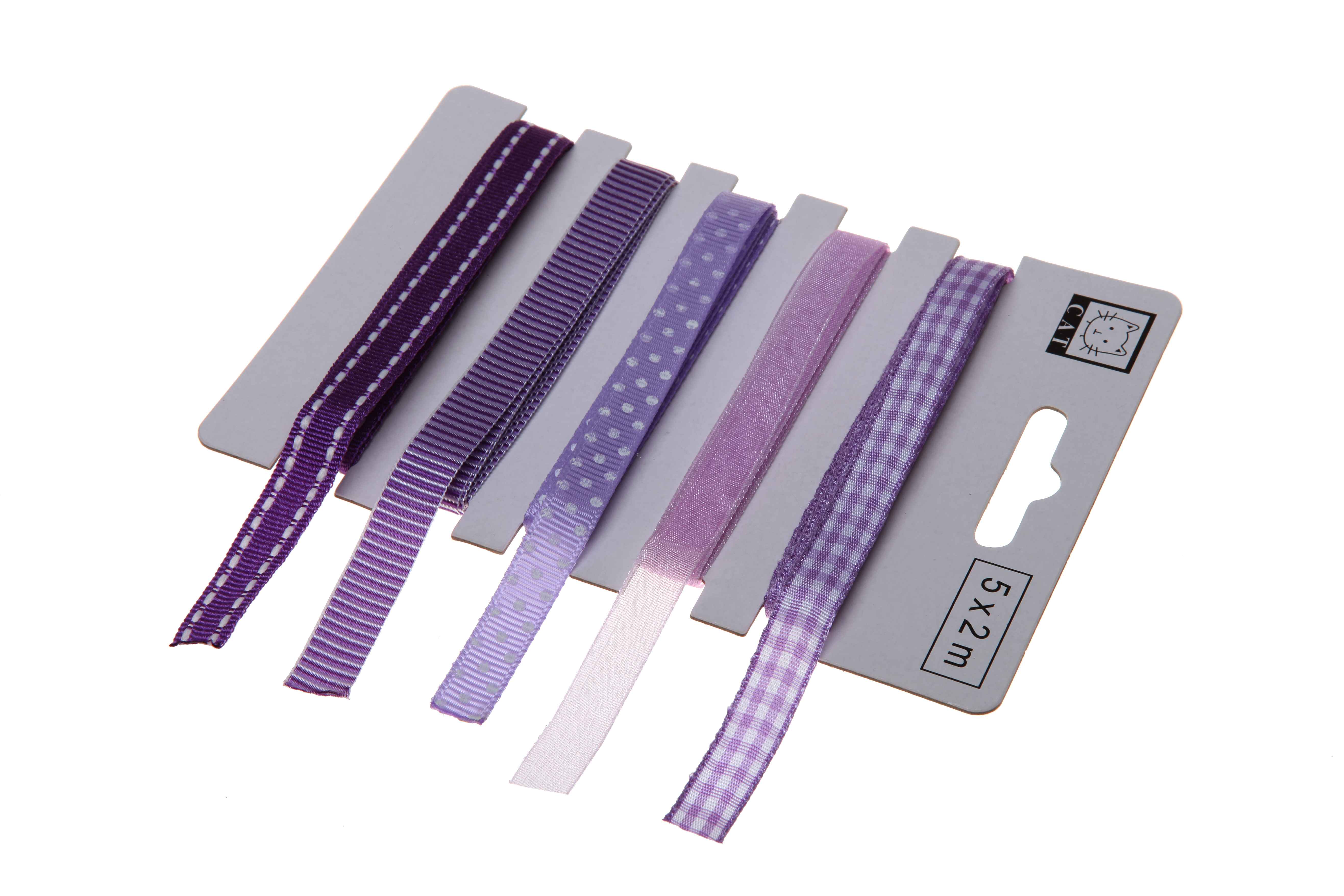 Set pěti fialových stuh různého vzoru. K rychlému použití na balení dárku a jako přízdoba květin, svíček, skleniček a různých dekorací. číst celé