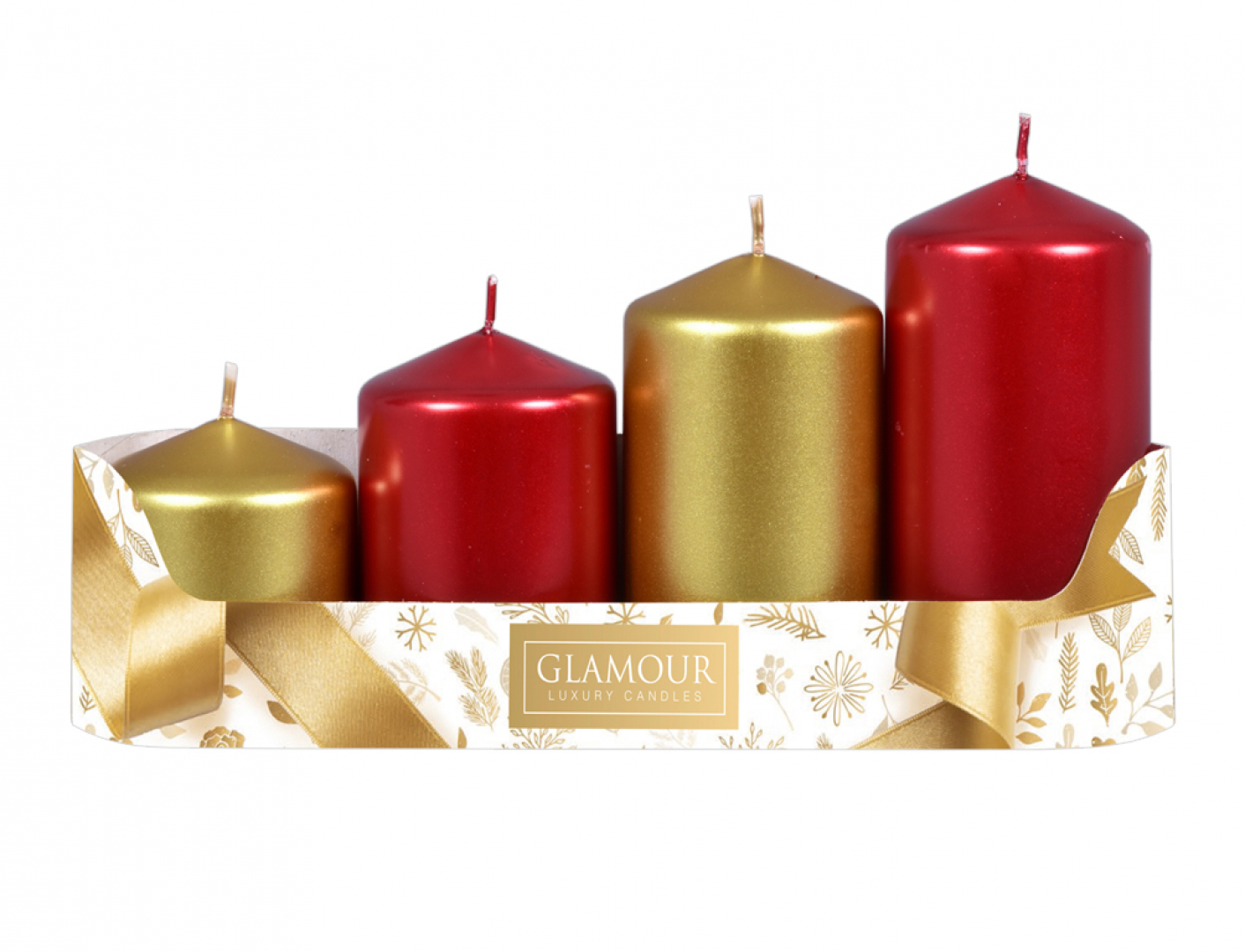 Sada adventních, stupňovitých svíček. Hladké svíčky ve tvaru válce se špičatou hlavou jsou kombinovány ve dvou sladěných barevných odstínech, pro dosažení ještě zajímavějšího dekorativního efektu. Tradiční, slavnostní kombinaci barev, zlatá a červená, dodává jiskru metalický povrch. Rozměry: průměr 5 cm, výška 6/7,5/9/10,5 cm. Doba hoření: 22 hodin. Materiál: parafín. Sada obsahuje 2ks svíček v barvě zlaté a 2 ks svíček v barvě červené.