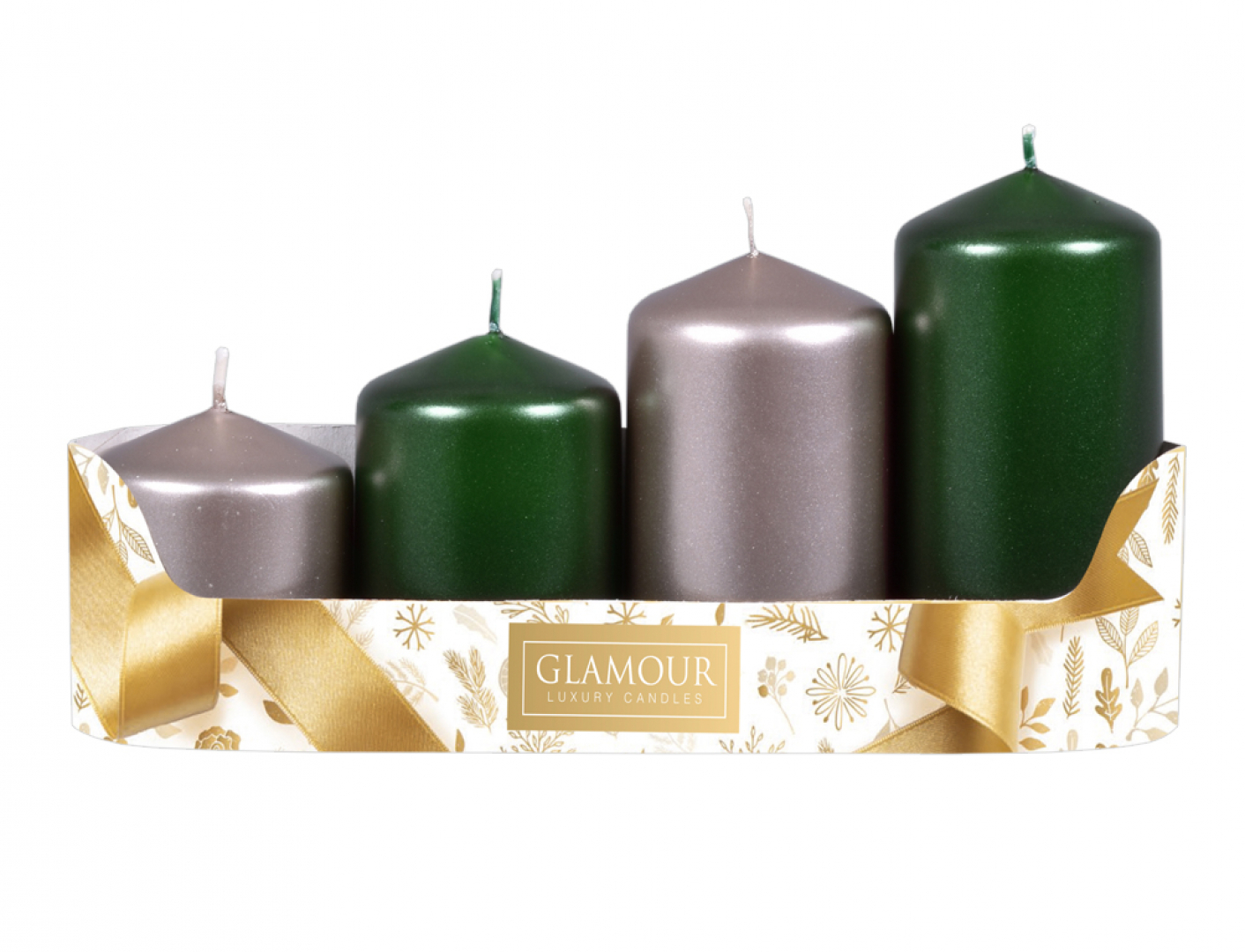 Sada adventních, stupňovitých svíček. Hladké svíčky ve tvaru válce se špičatou hlavou jsou kombinovány ve dvou sladěných barevných odstínech, pro dosažení ještě zajímavějšího dekorativního efektu. Intenzitu temně zeleného odstínu perfektně vyvažuje jemný odstín šampaň. Kombinaci dodává jiskru metalický povrch. Rozměry: průměr 5 cm, výška 6/7,5/9/10,5 cm. Doba hoření: 22 hodin. Materiál: parafín. Sada obsahuje 2ks svíček v barvě zelené a 2 ks svíček v barvě šampaň.