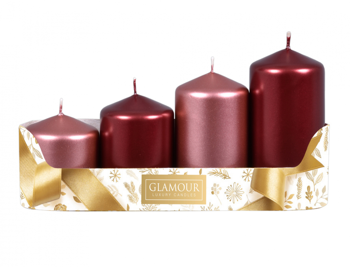 Sada adventních, stupňovitých svíček. Hladké svíčky ve tvaru válce se špičatou hlavou jsou kombinovány ve dvou sladěných barevných odstínech, pro dosažení ještě zajímavějšího dekorativního efektu. Moderní a výrazné kombinaci barev, růžovo-zlatá a bordó, dodává jiskru metalický povrch. Rozměry: průměr 5 cm, výška 6/7,5/9/10,5 cm. Doba hoření: 22 hodin. Materiál: parafín. Sada obsahuje 2ks svíček v barvě růžovo-zlaté a 2 ks svíček v barvě bordó.