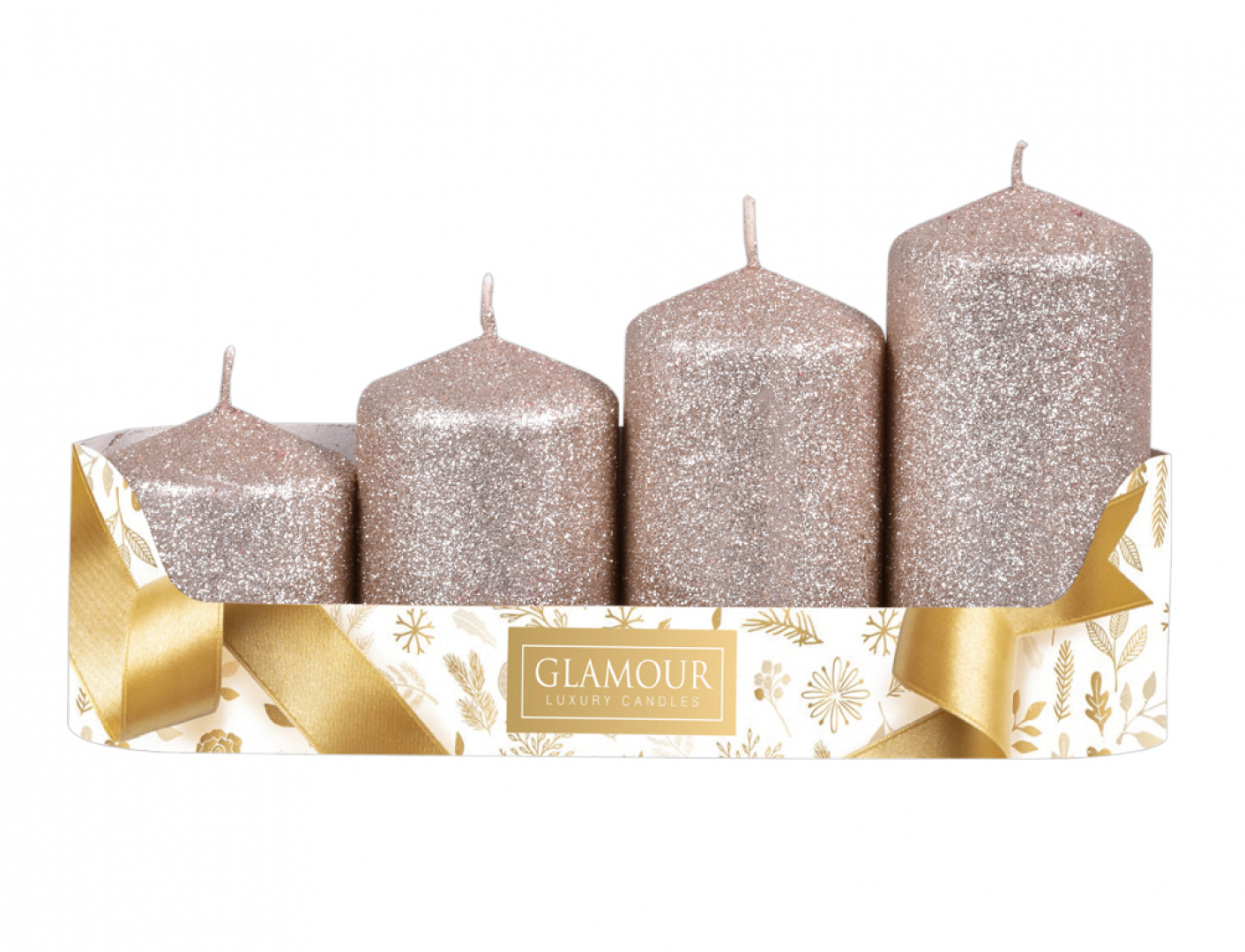 Svíčky adventní STUPŇOVITÉ glitrované d5x6/7,5/9/10,5cm 4ks