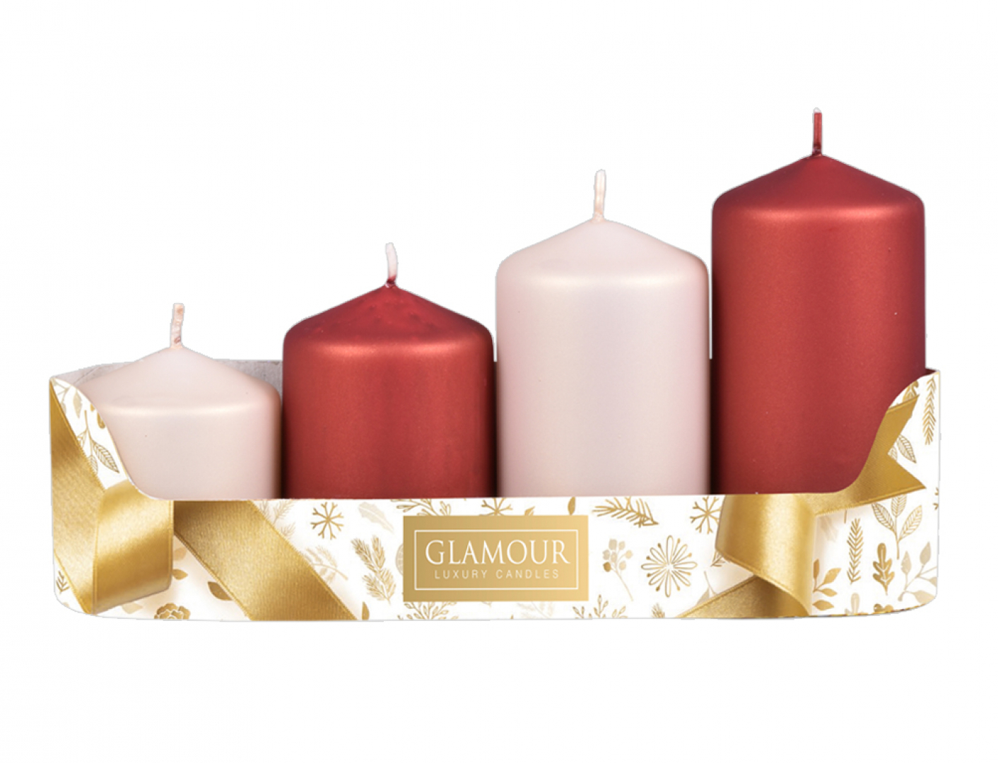 Sada adventních, stupňovitých svíček. Hladké svíčky ve tvaru válce se špičatou hlavou jsou kombinovány ve dvou sladěných barevných odstínech, pro dosažení ještě zajímavějšího dekorativního efektu. Kombinaci oblíbených barev, bordó a béžová, dodává punc výjimečnosti metalický povrch v matném provedení. Rozměry: průměr 5 cm, výška 6/7,5/9/10,5 cm. Doba hoření: 22 hodin. Materiál: parafín. Sada obsahuje 2ks svíček v barvě bordó a 2 ks svíček v barvě béžové.