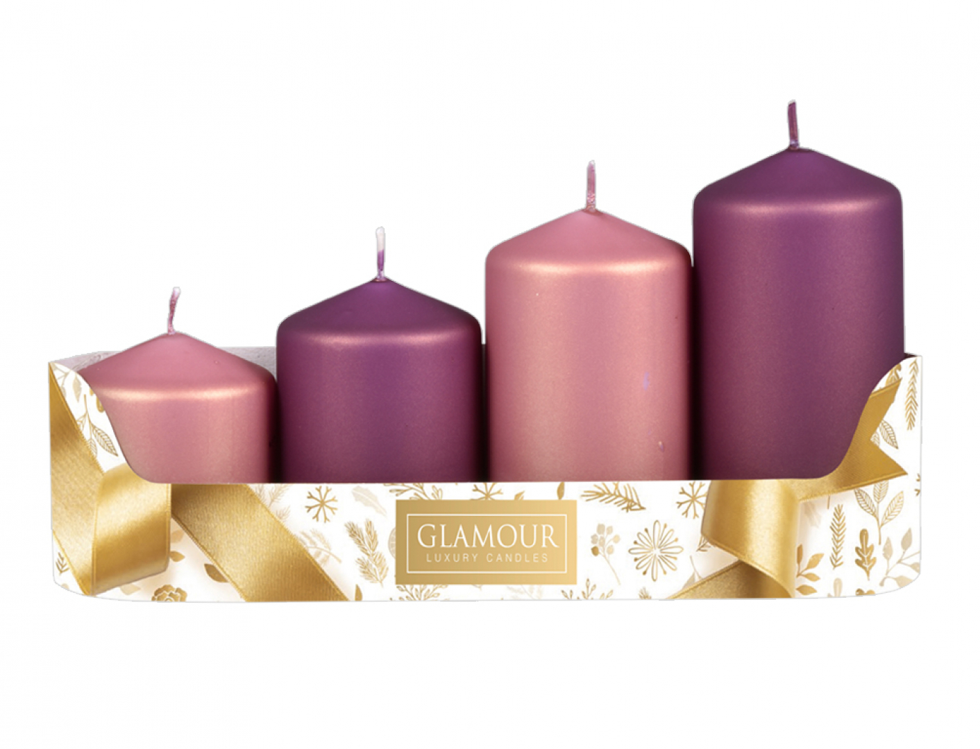 Sada adventních, stupňovitých svíček. Hladké svíčky ve tvaru válce se špičatou hlavou jsou kombinovány ve dvou sladěných barevných odstínech, pro dosažení ještě zajímavějšího dekorativního efektu. Kombinaci romantických barev, růžovofialová a tmavě fialová, dodává punc výjimečnosti metalický povrch v matném provedení. Rozměry: průměr 5 cm, výška 6/7,5/9/10,5 cm. Doba hoření: 22 hodin. Materiál: parafín. Sada obsahuje 2ks svíček v barvě fialovorůžové a 2 ks svíček v barvě tmavě fialové.