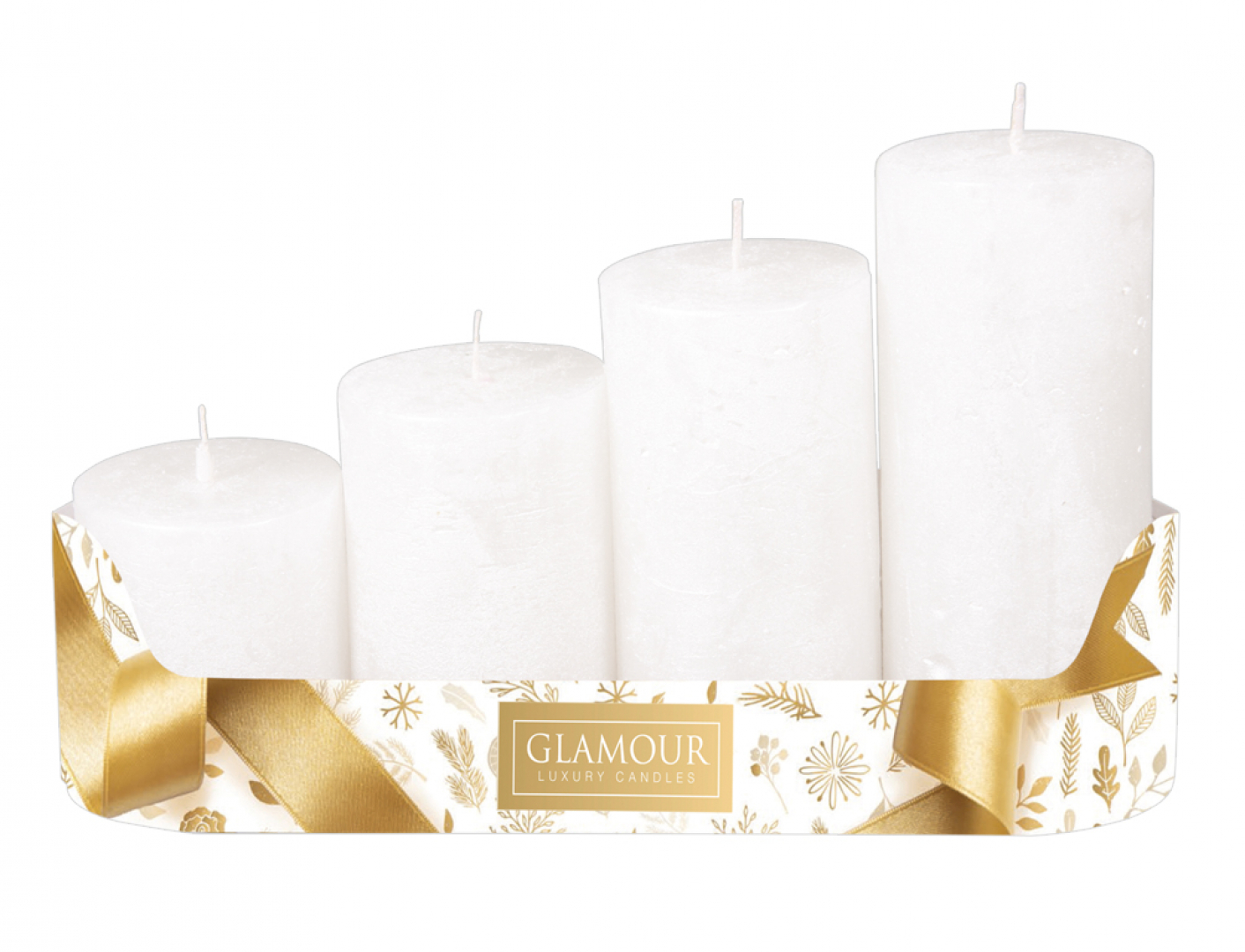 Adventní svíčky s rustikálním matným povrchem. Svíčky jsou stupňovité: průměr: 5 cm, výšky: 6 cm, 8 cm, 10 cm, 12 cm. Barva: bílá.