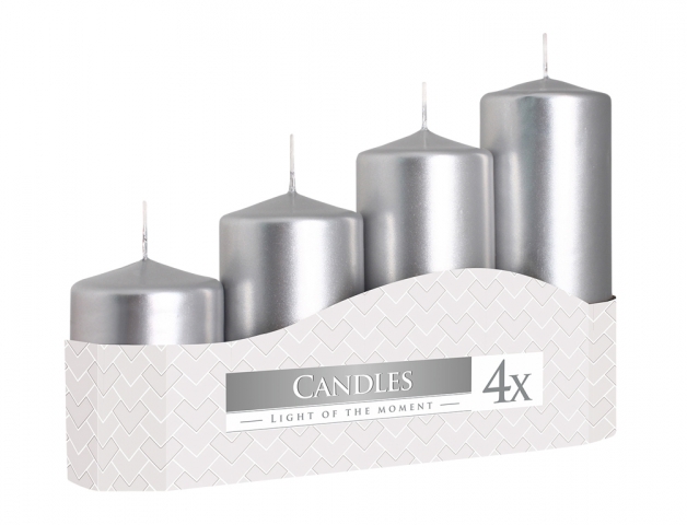 Lesklé stříbrné adventní svíčky ve tvaru válce setříděné dle výšky. Průměr 5 cm, výška: 7, 9, 11, 13 cm. Doba hoření: 11 hod, 16 hod, 22 hod, 33 hod.