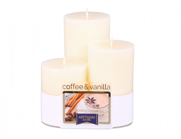 Set 3 kusů stupňovitých svíček s vůní kávy a vanilky. Průměr: 6 cm, výšky: 7,5 cm, 10 cm, 12,5 cm. číst celé