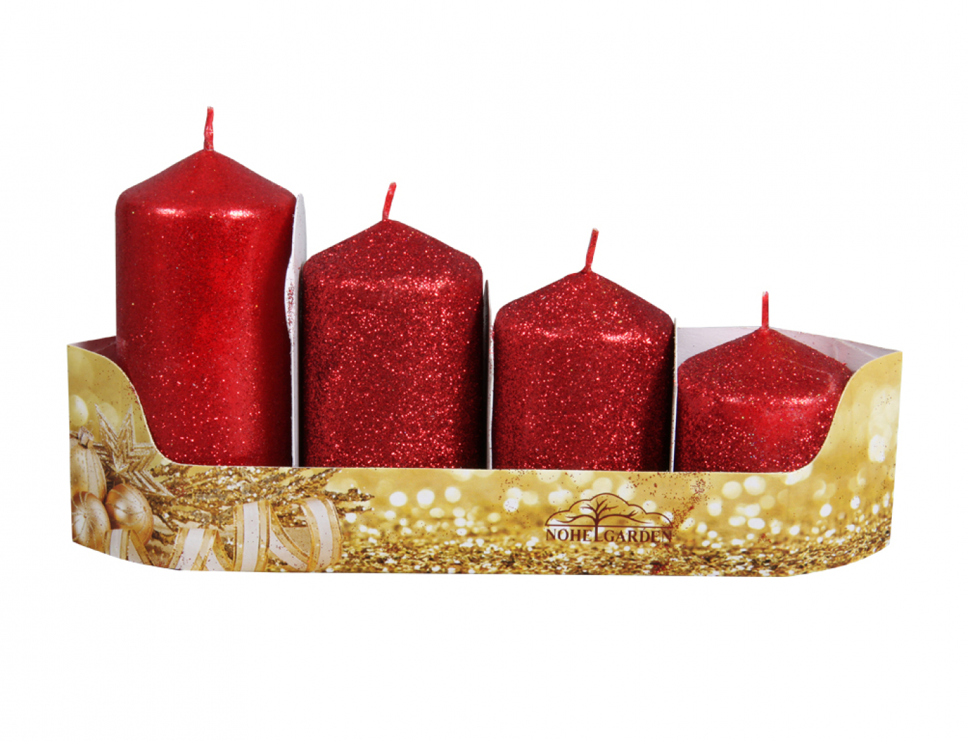 Adventní, stupňovitá glitrovaná svíčka. Má hladký, matný povrch s oslnivým třpytem. Rozzáří přírodní adventní věnec i jakoukoli vánoční vazbu či dekoraci. Rozměry: průměr 5 cm, výška 6 cm, 7,5 cm, 9 cm, 10,5 cm. V balení jsou 4 ks svíček. Doba hoření: 9 h, 15 h, 19 h, 23 h. Barva: červená.