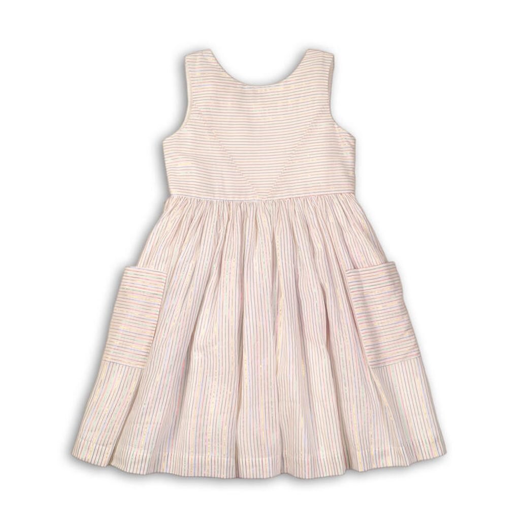 Dívčí bavlněné šaty bez rukávů s dvěma kapsami na bocích. V bílém podkladu s barevnými proužky po celé délce. číst celé
