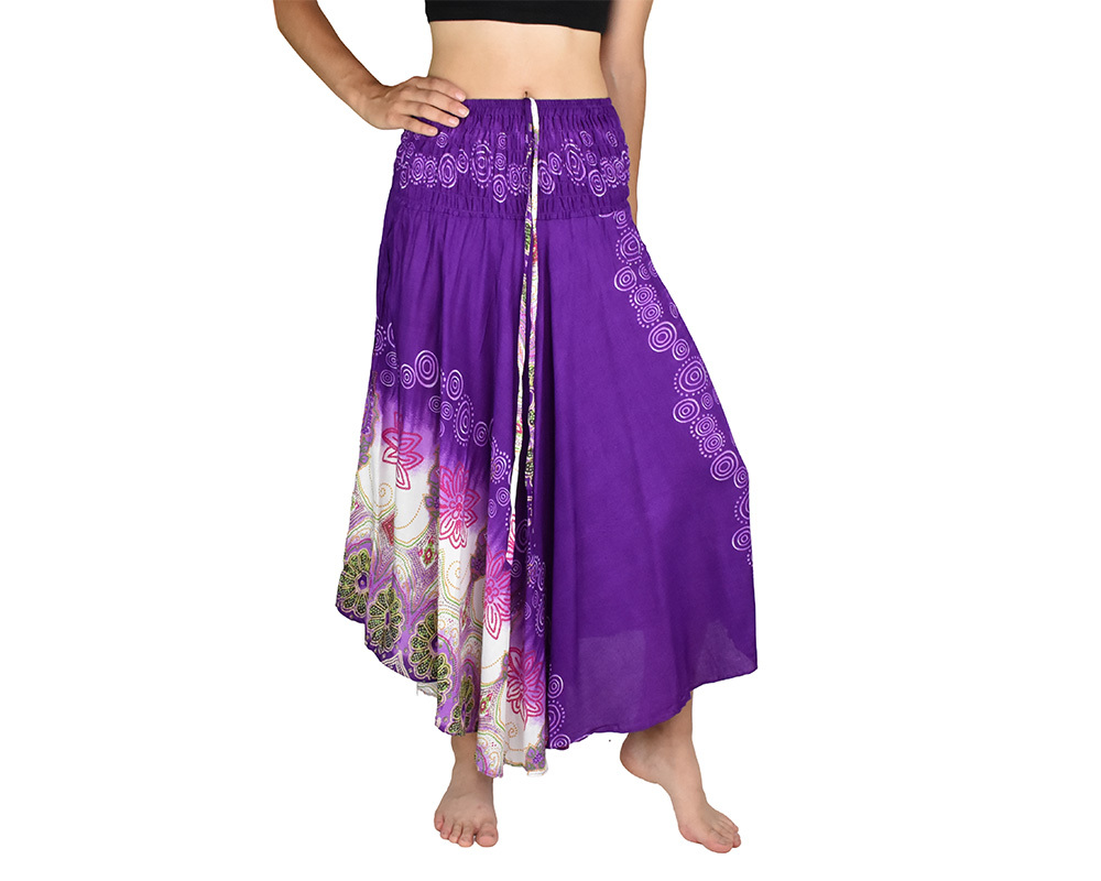 Pohodlná letní sukně s širokým žabičkovaným pasem v kolovém stylu. Díky šňůrkám lze nosit i jako minišaty.