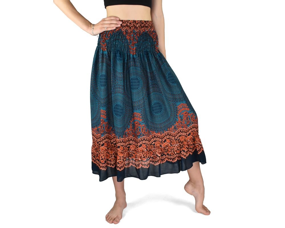 Pohodlná letní sukně s širokým žabičkovaným pásem v áčkovém střihu.
