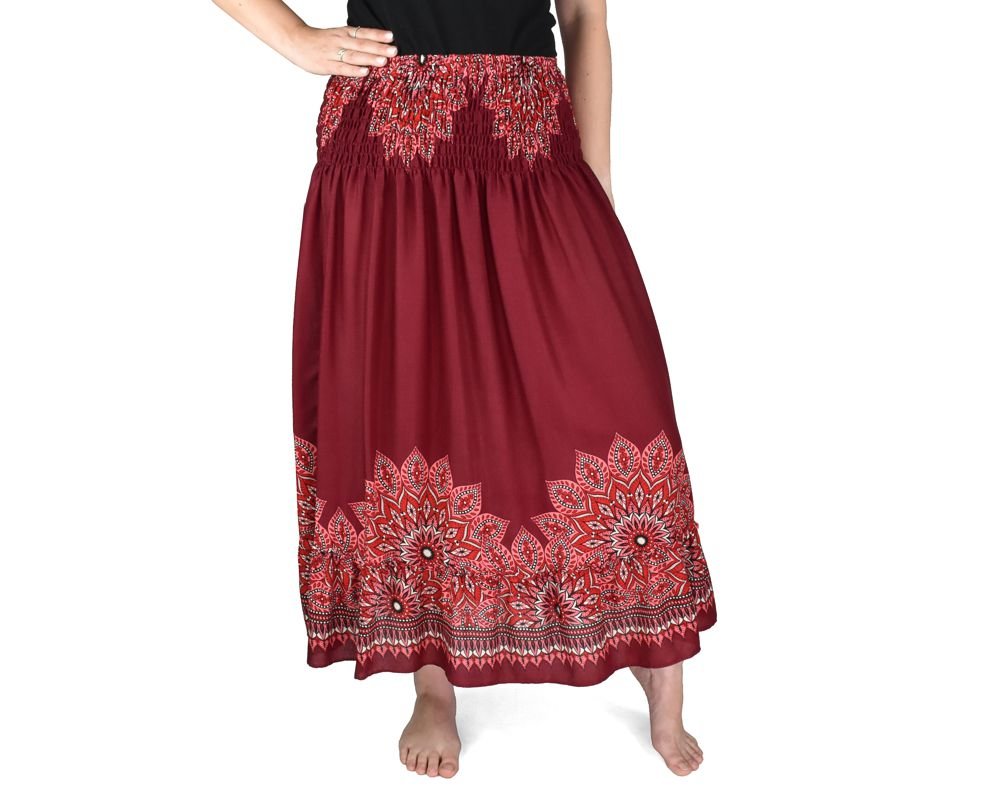 Pohodlná letní sukně s širokým žabičkovaným pásem v áčkovém střihu.
