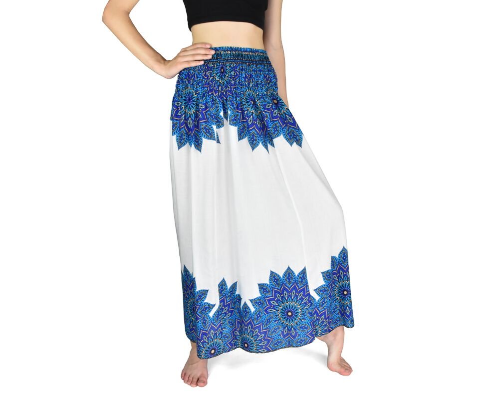 Dlouhá sukně KAMON, mandaly, bílá s modrou Varianta B (pruh dole)