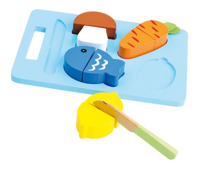 Máš v kuchyni vše připraveno k vaření rybí speciality? Potraviny jsou umyté? Zbývá je už jen nakrájet. Přichystej si prkénko a nůž a můžeš začít - ryba, mrakev, hříbek a citron na dochucení. Součástí balení je prkénko, dřevěný nůž a 4 druhy potravin, které děti mohou krájet na polovinu. Zelenina a ryba drží vcelku pomocí suchého zipu. Vhodné pro děti od 3 let.