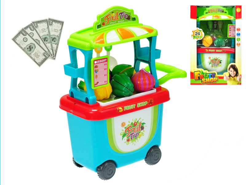 Pojizdný vozík v podobě prodejny zeleniny a ovoce o rozměrech 23x38x216cm potěší všechny malé prodavače. Součástí je ovoce, zelenina a také doplňky v podobě peněz.