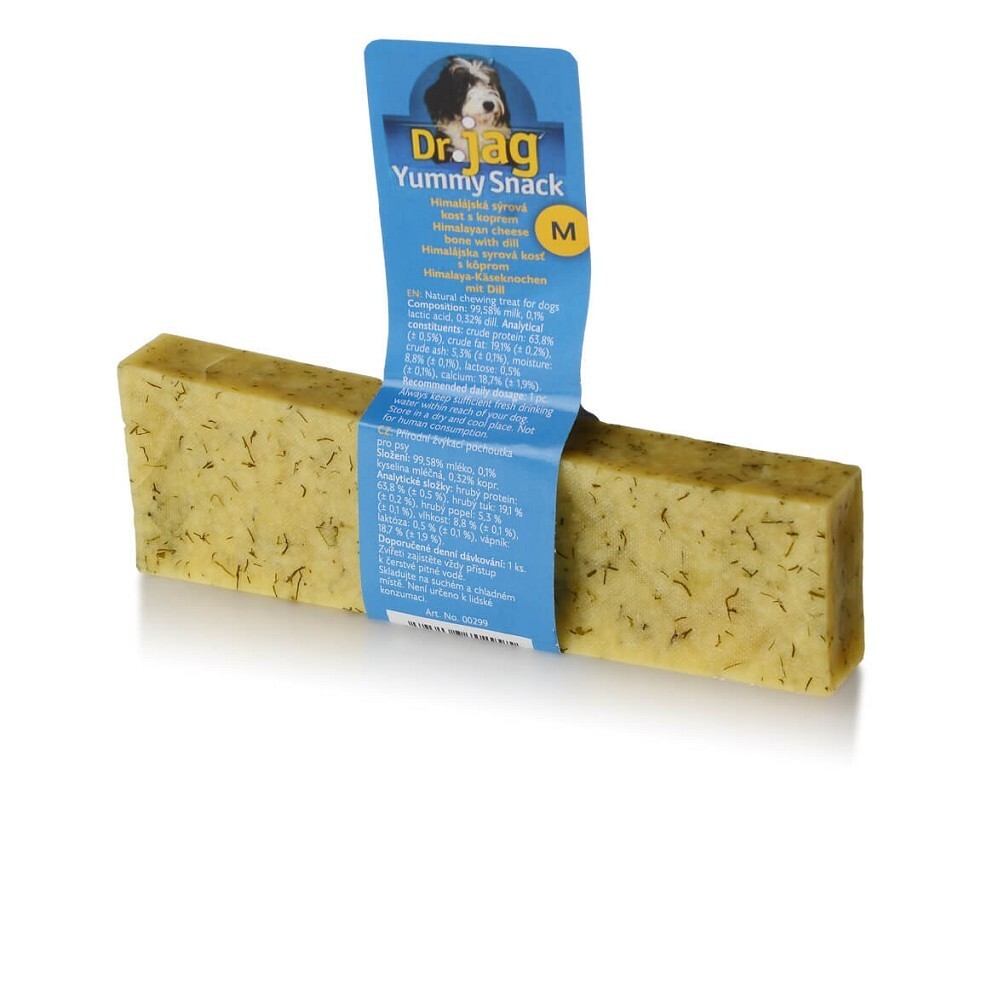 Přírodní sýrový pamlsek s koprem pro psy inspirovaný starodávným himalájským receptem. Pamlsek je vyroben z čerstvého mléka, který se lisuje a suší po dlouhou dobu, aby se dosáhlo požadované úrovně tvrdosti. Lehce stravitelný pamlsek, vhodný také pro psy s intolerancí na laktózu. Obsahuje prospěšný vápník a vitamín A, D. Vhodné pro psy každého věku a plemene.