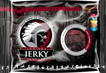 Indiana Jerky beef (hovězí) Peppered je pochoutka z hovězího sušeného masa. Skvělý snack, delikatesa pro labužníky s kousky drceného pepře vhodný pro každou příležitost, když chcete zkusit něco opravdu kořeněného. Každé balení obsahuje absorbér kyslíku, který zachovává chuť a aroma bez jakékoli negativní kontaminace po celou dobu trvanlivosti produktu.