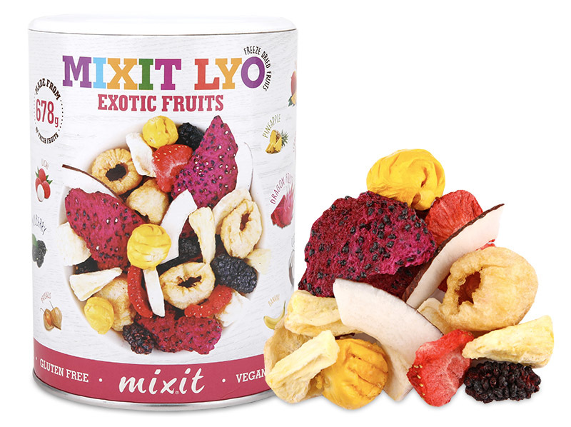 Lyofilizované ovoce v exotické sestavě! Namixovali jsme pro vás kombinaci 8 druhů exotických dobrot, kterou jsme doplnili o sladké jahody. Mrazem sušené ovoce jako vždy zůstává krásně barevné, plné chuti a vitamínů s efektem ohlušujícího křupnutí. Těšte se na liči, banán, moruši, ananas, jahody, pitahayu, mango, physalis a plátky kokosu. Dobrou chuť!