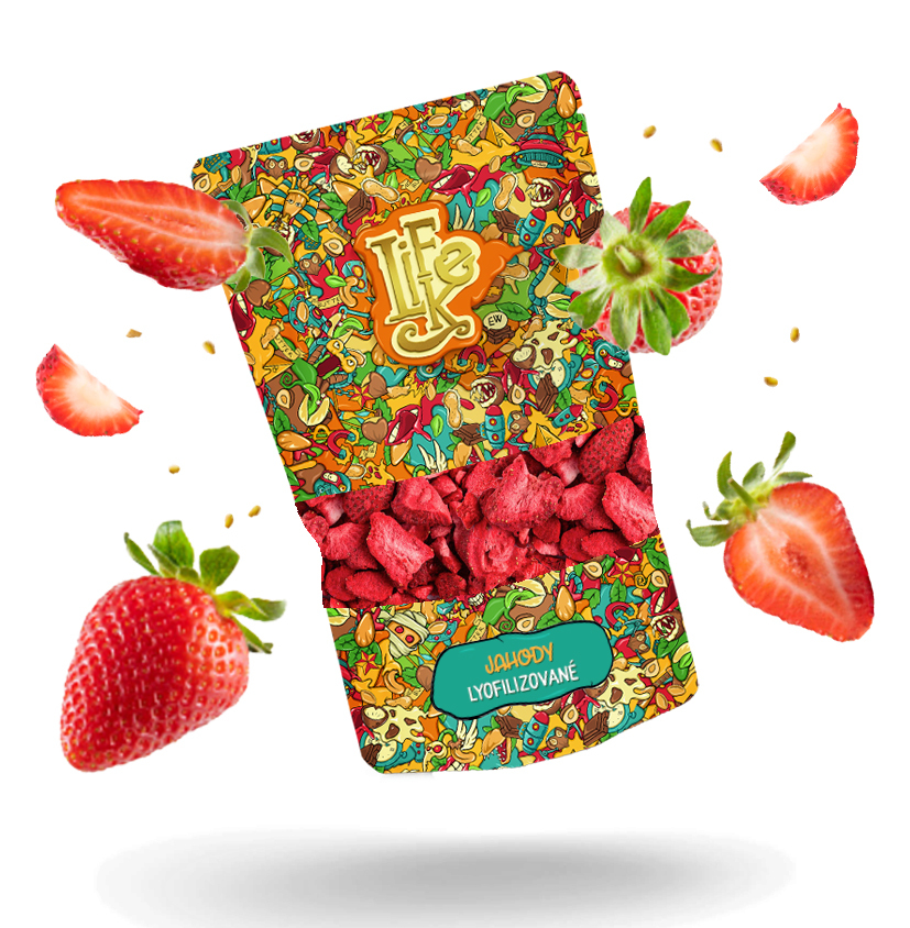 100% jahody, které mají zachovanou barvu, tvar i chuť čerstvých jahod, bez jakýchkoliv přidaných stabilizačních látek nebo dochucovadel, k lyofilizaci jsou vybrané vždy jen ty dozrálé čerstvé plody.