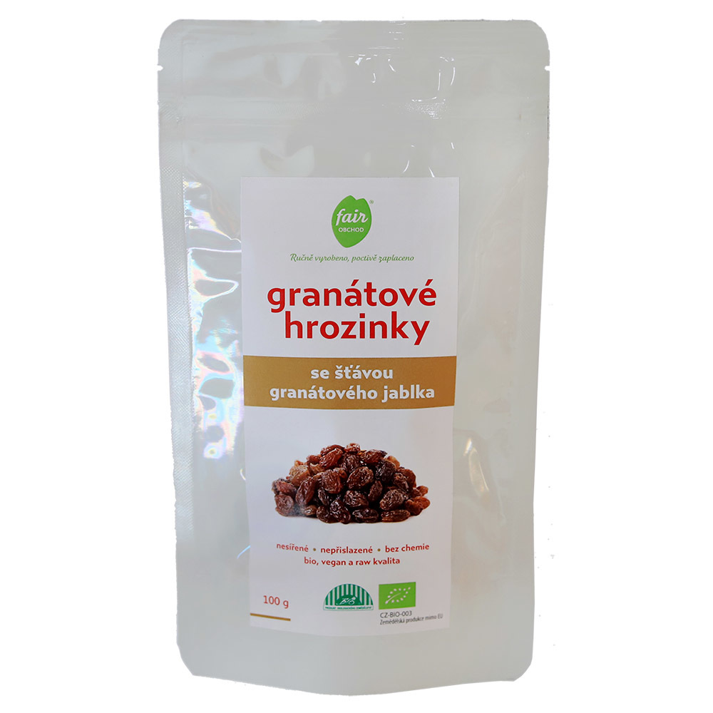 Složení: bio hrozinky, bio šťáva z granátového jablka. Může obsahovat stopy OŘECHŮ.