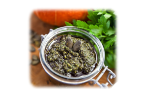 Dýňová semínka opražte v troubě (na 180°C cca 20 minut) nebo na pánvi. Až semínka vychladnou, rozmixujte je společně s křenem. Přidejte koriandr, limetkovou šťávu a olivový olej. Pokud bude pesto moc husté, přidejte trošku oleje.