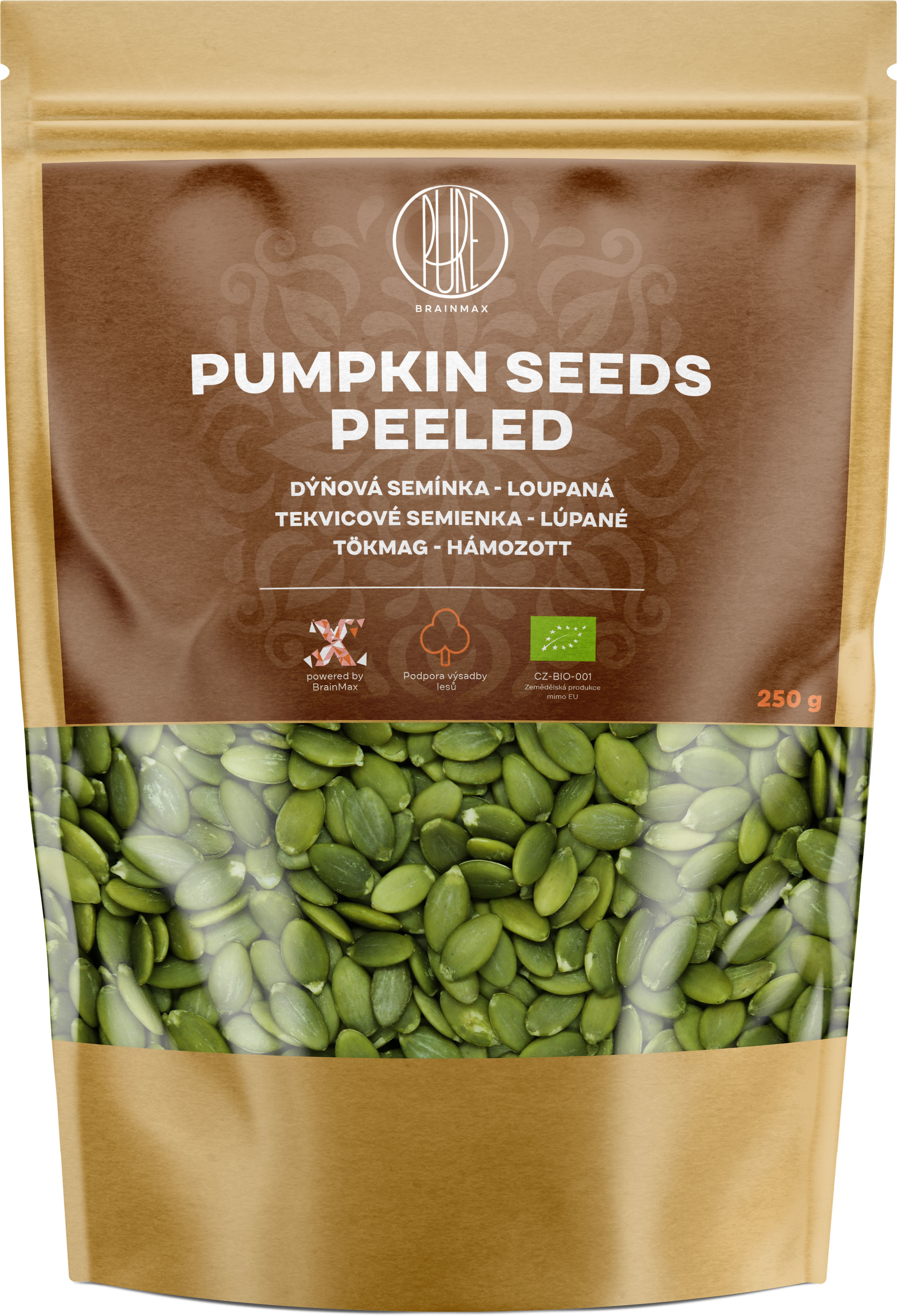 Dýňová semínka mají tmavě zelenou barvu a svým využitím se hodí opražené do salátů, polévek k posypání pečiva, nebo jako přísada do nejrůznějších snídaňových kaší.Jsou bohatým zdrojem bílkovin. 100g dýňových semínek obsahuje až 30g bílkovin. Také jsou zdrojem aminokyseliny tryptophan, která podporuje zdravý spánek a z minerálů jsou velmi bohatá na zinek. Minerál, který je nezbytný pro zdraví vlasů, zubů a nehtů. Semínka jsou zbavená slupky a jsou v BIO kvalitě. Pokud budete chtít ze semínek využít co nejvíce, doporučujeme namočit na několik hodin do vody. Semínka pak budou lépe stravitelná a tělo z nich vstřebá více živin. Semínka obsahují nenasycené mastné kyseliny, především omega 3 a kromě zinku jsou plná vápníku, železa, fosforu, selenu a draslíku.