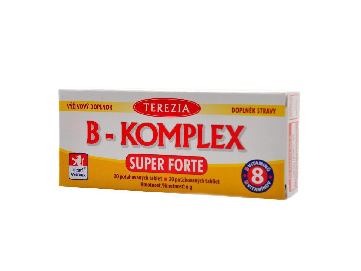 Komplex osmi vitaminů skupiny B rozpustných ve vodě. B-komplex super forte je obohacen o vitaminy B7, B9 a B12 a obsahuje i kyselinu listovou. Tyto vitaminy jsou důležité pro udržení mnoha dějů v lidském organizmu. Účinky všech 8 vitaminů se navzájem doplňují a podporují. Hlavním zdrojem vitaminů skupiny B z potravy jsou kvasnice, maso, sýry, celozrnné obiloviny, luštěniny a ořechy. Produkt je určen k doplnění běžné stravy pro děti od 12 let a pro osoby, kteří mají vitaminů B nedostatek. Vitaminy B1, B3, B7 a B12 přispívají k normální funkci nervové soustavy a psychické činnosti.