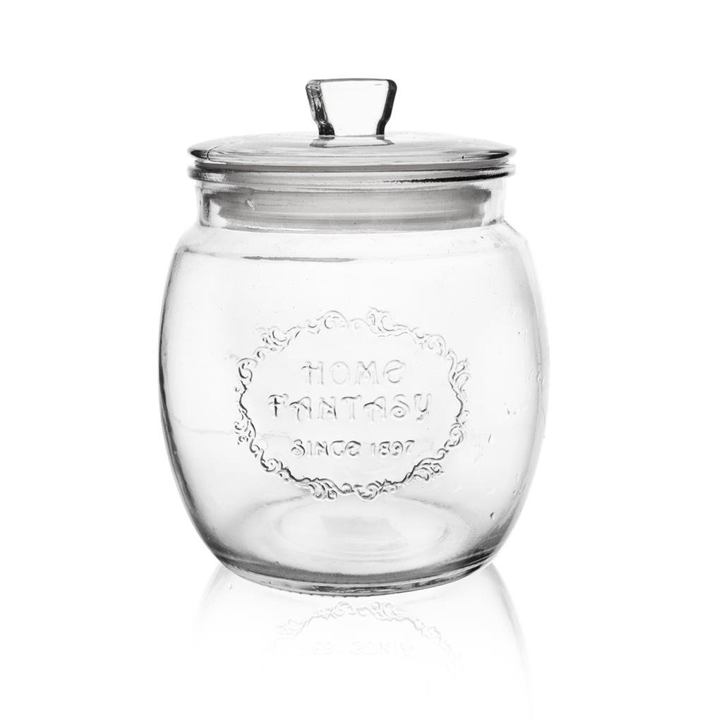 Dóza s víčkem na uložení koření, sušených plodů, bylinek a potravin... Materiál: sklo, plast. Rozměry: objem 1 l, pr. 11 cm, v. 15 cm.