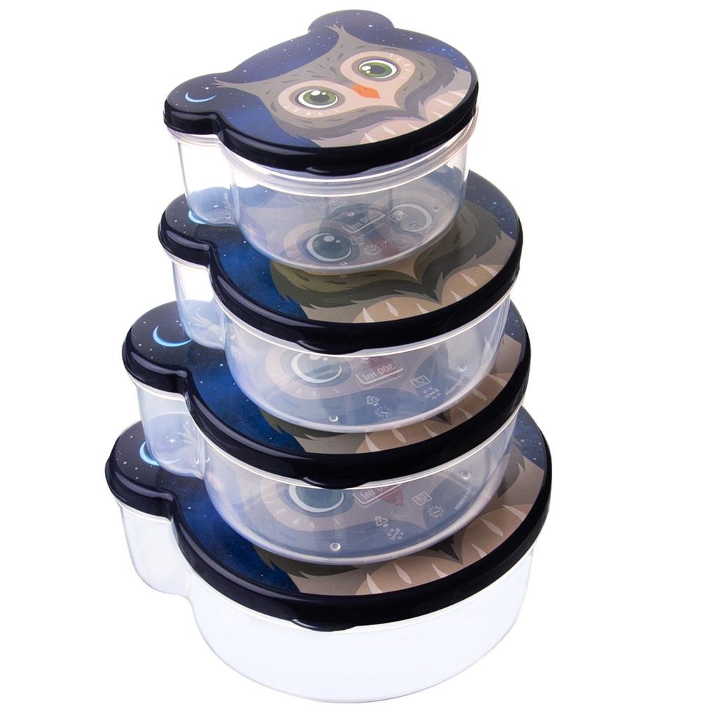 Sada boxů na svačinu potěší svým tvarem děti. Obsahuje 4 různé velikosti boxů s víčkem. Materiál: kvalitní plast. Použití max. 95 °C. Vhodné do myčky na nádobí i do MVT - bez víčka. Rozměry: objem 0,2 l/0,3 l/0,5 l/0,75 l. číst celé