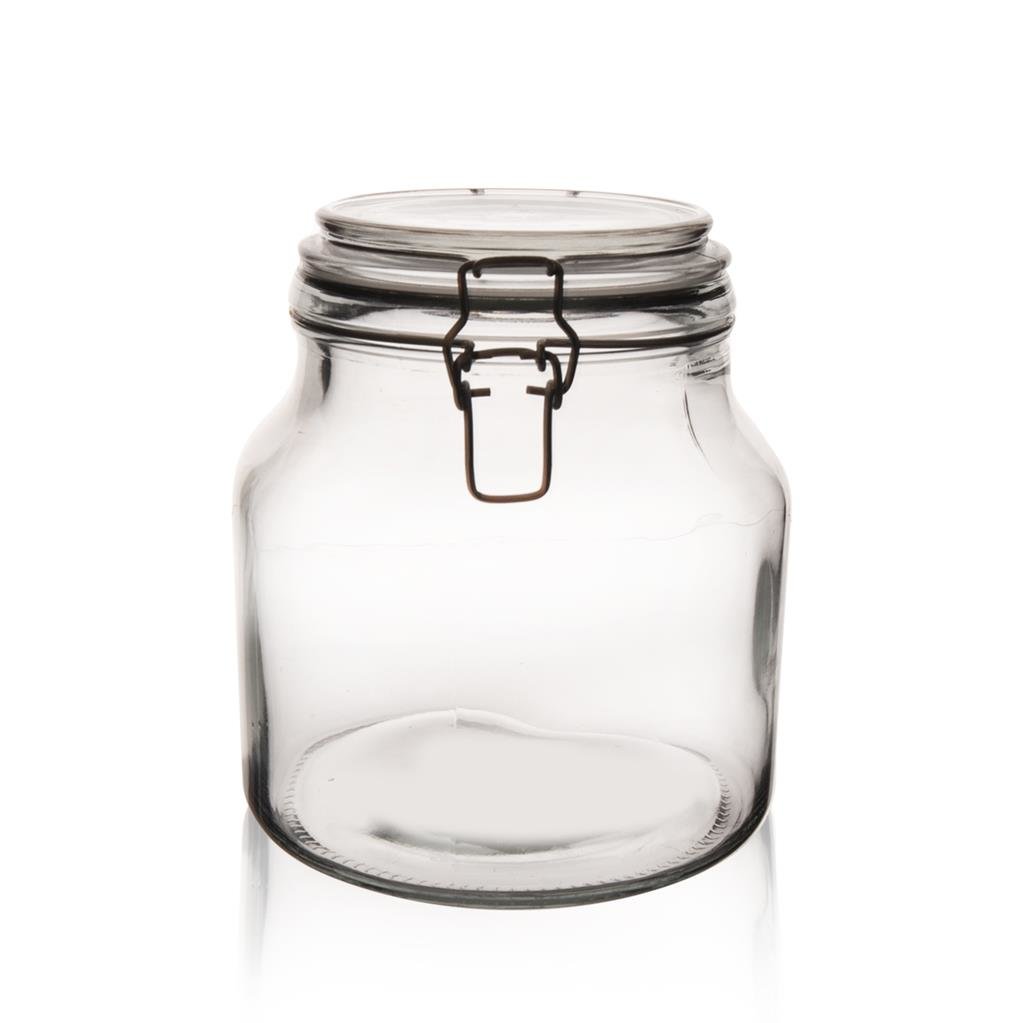 Dóza skleněná patentní s klasickým silikonovým těsněním a drátěným uzávěrem. Rozměry: objem 2,4 l, pr. 16 cm, v. 18 cm. Náhradní těsnění 6 ks z naší nabídky 180809. Do myčky vhodné pouze sklo. Častým používáním myčky může docházet k šednutí skla.
