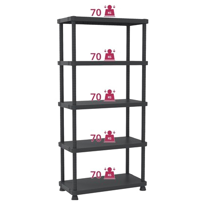 Policový regál plastový o nosnosti 70 kg jedné police. Regál lze sestavit bez potřeby nářadí a složitého montování. Regál s 5 policemi z dřevotřísky. Výšku police si nastavíte podle svých potřeb. Plastové chrániče ochrání podlahu před poškrábáním.
