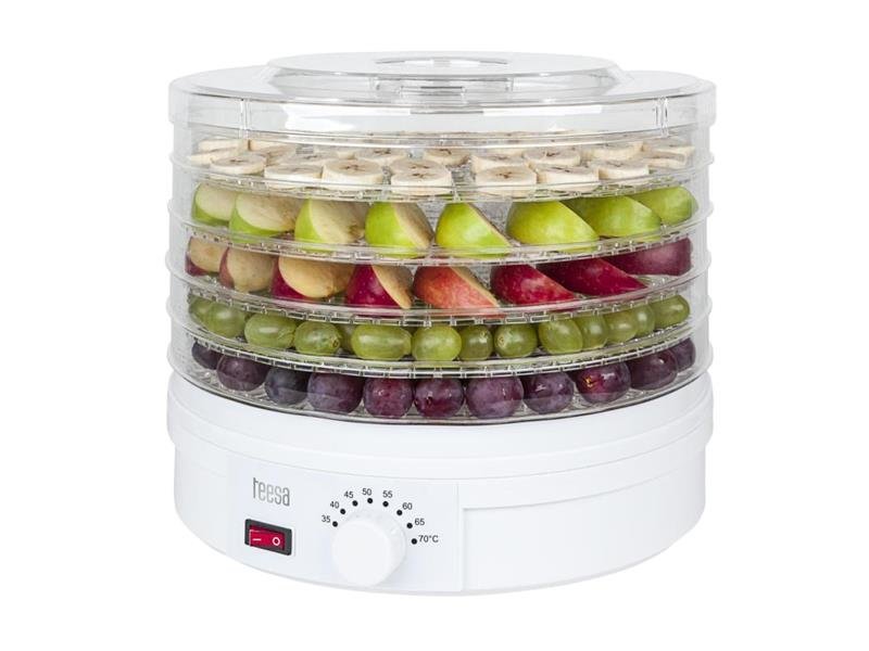 Sušička potravin je zařízení, které by mělo být v kuchyni každého fanouška zdravé výživy. Díky tomu si můžete vychutnat chuť hub, zeleniny a ovoce po celý rok bez přidávání konzervačních látek a jiných umělých přísad. Kromě toho vám umožní sušit květiny, léčivé rostliny, byliny a připravovat müsli. Způsob použití i proces sušení jsou velmi jednoduché. Stačí umístit dříve připravené produkty na síto a nastavit vhodnou teplotu, při které chceme jídlo sušit. Mezi horním krytem, sušicími sítami a základnou začne proudit teplý vzduch, který vypařuje vodu obsaženou v ovoci a zelenině, ale zachovává jejich chuť a vůni. Sušička TSA3030 je vybavena pěti sítami o průměru 32 cm, které vám umožní sušit až 5 kg jídla. Nyní, bez ohledu na roční období, si můžete při setkáních užít dávku přírodních vitamínů nebo překvapit své přátele zdravým občerstvením.