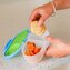 Díky flexibilnímu silikonovému víčku na jedné straně můžete do krabičky vložit celý kus ovoce (např. jablko) a do druhé třeba i jogurt nebo pyré (nikoliv tekutiny). Jednoduché otevírání umožní dětem samostatně se obsloužit.