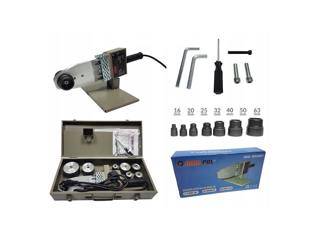 Díky široké škále teflonových nástavců (16-63 mm) zvládne práci s běžnými typy plastových trubek (PPR, PP, PE). Regulace teploty až do 300 °C umožňuje přesné nastavení podle materiálu. Svářečka je dodávána v praktickém kovovém kufru, který usnadňuje přepravu i skladování.