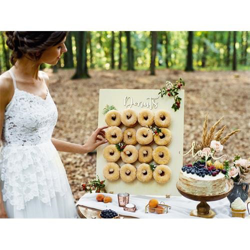 Dřevěný stojan na pověšení donutů s ozdobným nápisem Donuts. Stojan je ideální pro svatební candy bary, firemní snídaně, narozeninové oslavy v nature stylu, svatby v přírodě. Má moderní rustikální vzhled, je vyroben z přírodního dřeva. Dřevěná stěna je celkem pro zavěšení 18ks donutů a je určena pro vlastní montáž. Rozměr 45 x 55 cm