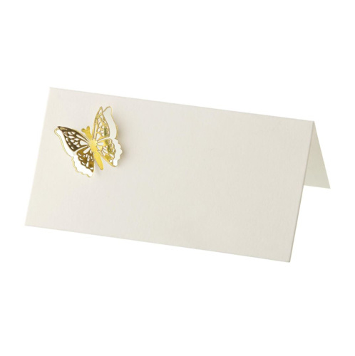 Jmenovky Zlatý motýl - 10ks. Ohromující označení míst s laserem vyřezaným zlatým motýlem. Jmenovky, vyrobené ze slonovinového kartonu, odkáží vaše hosty k jejich sedadlům. Mohou být použity samostatně nebo jako doplněk s jinými dekoracemi s motivem motýlů. Krásný způsob, jak začlenit tento oblíbený motiv do vaší svatební výzdoby. Dodáváno v balíčcích po 10 jmenovkách
