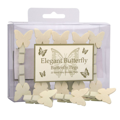 Krémové dřevěné kolíčky. Tyto všestranné kolíčky s motivem motýlka představují snadný způsob, jak vylepšit vaši svatební výzdobu. Použijte například pro přichycení menu na ubrousky nebo pro připevnění koordinačního štítku na stůl. Balení: 20 ks