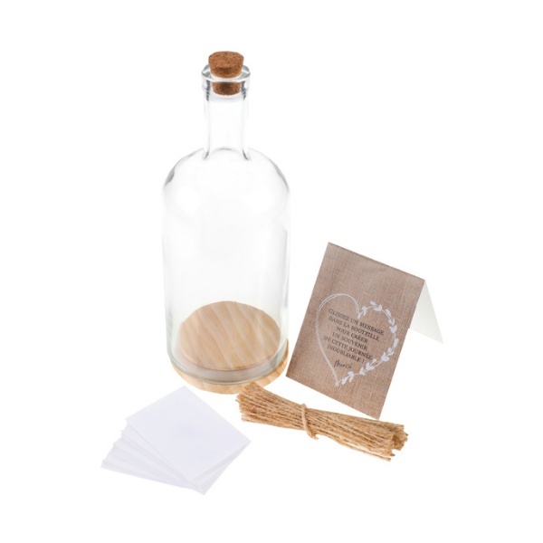 V balení najdete vše potřebné: skleněnou láhev, 50 papírků na vzkazy, jutové provázky pro elegantní zavázání jednotlivých vzkazů a informační cedulku, která vašim hostům usnadní, co mají dělat. Láhev má ideální rozměry 8,5 x 23,5 cm, díky kterým je praktická a zároveň esteticky působivá.