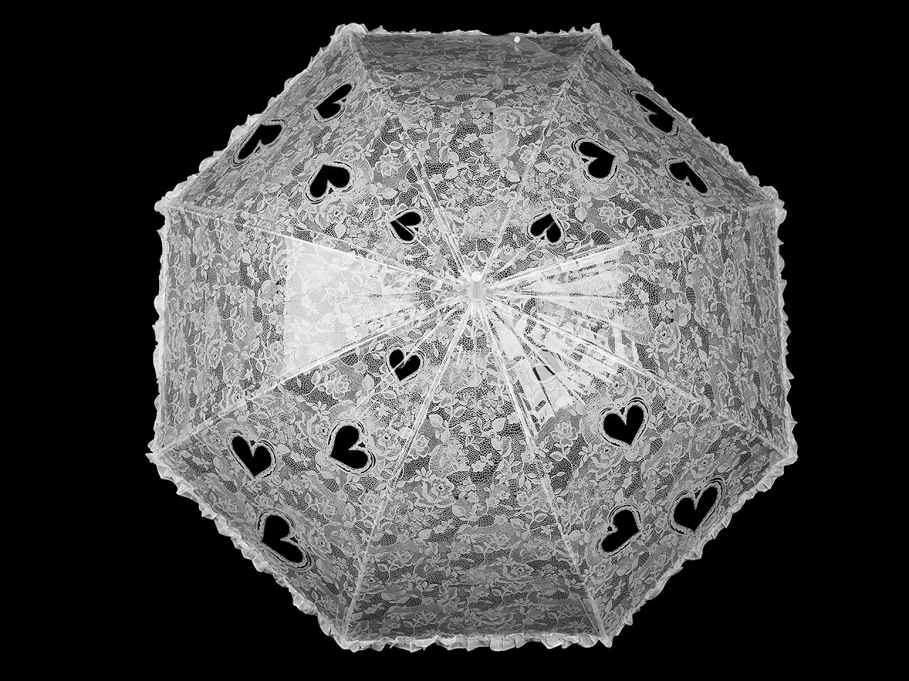 - Průhledný deštník s bílým potiskem krajky a srdcí