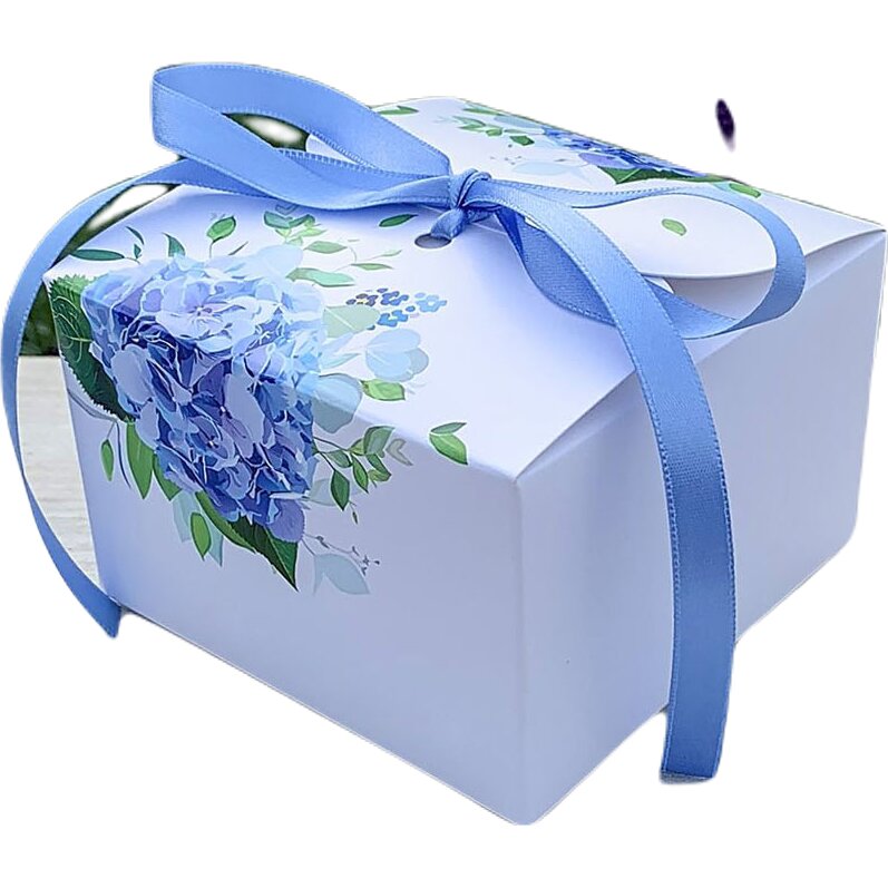 Svatební krabička na výslužku bílá s modrými hortenziemi s mašlí (11 x 11 x 7 cm) 8ks - Goldpress