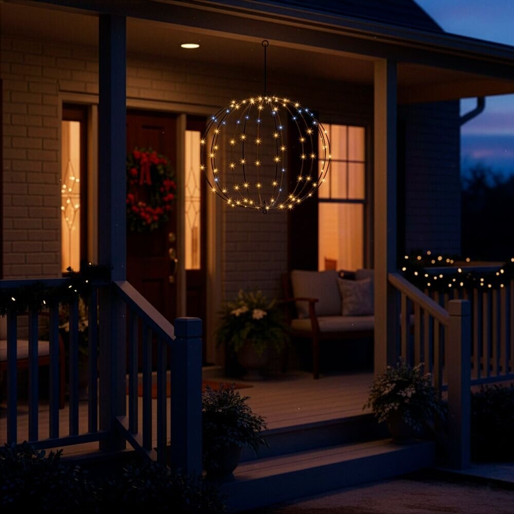 LED světelná koule 65 cm 160 LED IP44 teplá bílá + záblesky je prémiová závěsná dekorace, která vnese do prostoru moderní eleganci a jedinečnou atmosféru. Teplé bílé světlo vytváří příjemný základní svit, který je efektně oživen jemnými bílými záblesky, díky nimž dekorace působí živě a luxusně jak ve dne, tak po setmění.