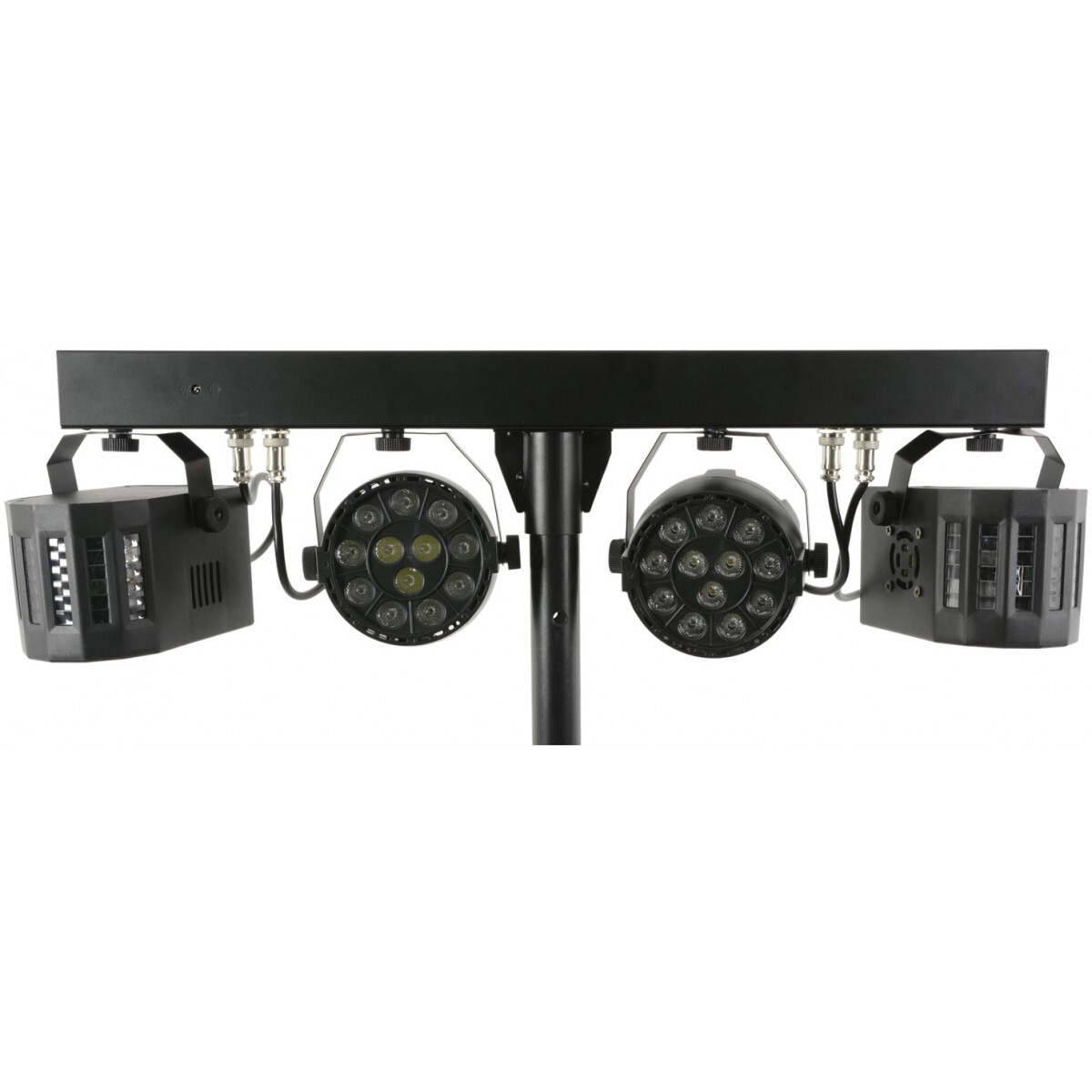 Světelný set Derby FX obsahuje dva PARy a dva světelné LED efekty umístěnými na liště ve tvaru T. Ovládání možné pomocí DMX, infračerveného dálkového ovládání nebo interních automatických a zvukově aktivovaných programů volitelných z ovládacího panelu. Každé svítidlo má nastavitelný úhel distribuce světla pro efektivní osvícení místnosti. Navrženo jako kompletní řešení světelných efektů pro kluby, koncerty a další události. Dodává se s teleskopickým stativem, kompatibilní s DMX512.