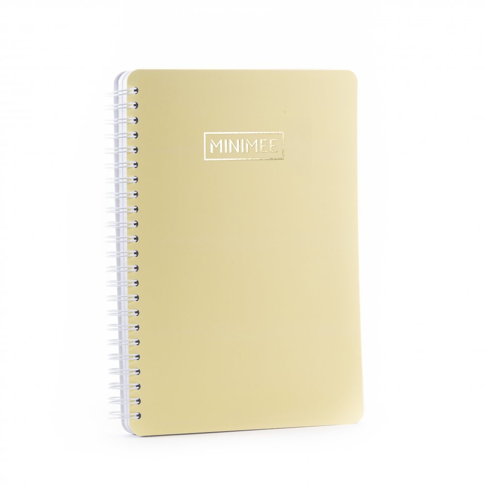 Originální tečkovaný zápisník A5 MINIMEE s luxusním zlatým prvkem a sametovou obálkou v pastelově žluté barvě, který potěší všechny pisálky a milovníky bullet journalu či scrapbookingu.